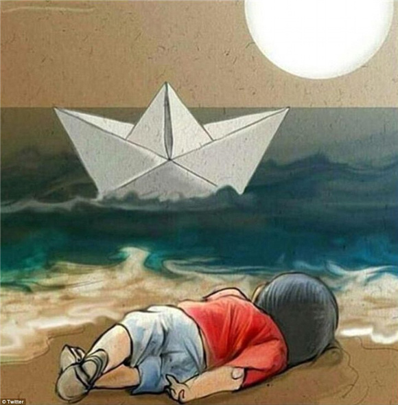 事情發(fā)生后,人們紛紛在網(wǎng)上以漫畫哀悼小Aylan。有像"上帝會在你左右的,小天使"這樣的傷感,也有對難民危機(jī)的反思和對戰(zhàn)爭的批判。